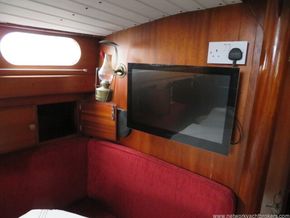 Aft of the heads is the saloon which has a U-shaped settee to port with a saloon table that will drop to make into a double berth. There is storage under the saloon settees and lockers above. There is a TV mounted on the bulkhead.