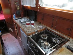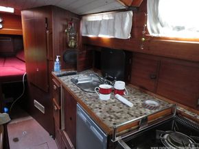 The engine is located under the companionway steps, that can be easily removed, The steps lead you up to the cockpit which is spacious for the size of yacht. It has a full cockpit enclosure which provides additional sleeping and entertainment space.