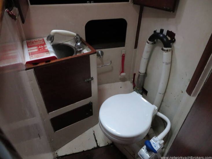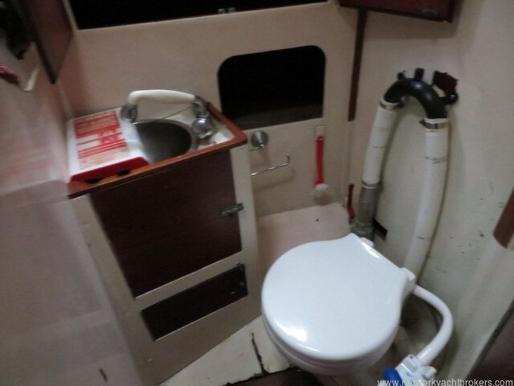 Aft of the forward cabin and to port is the heads which has a marine manual toilet with a vanity unit with a cupboard and sink with hot and cold pressurised water. Hot water headed by the 240v immersion heater. Opposite the heads is a hanging locker for oilies.