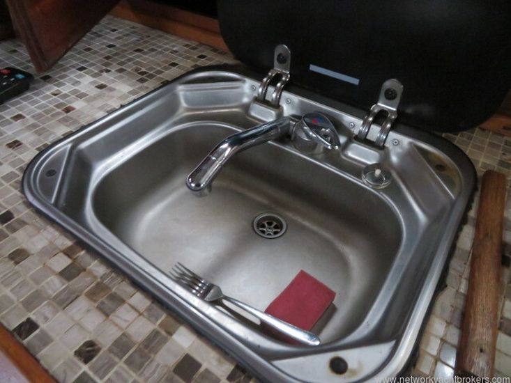 Opposite the saloon table is the galley which has a single sink with hot and cold pressurised water, a 12v fridge and three burner gas hob with oven and grill. The galley has lots of storage lockers for utensils, crockery and cutlery and food.